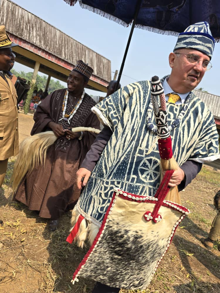 Le 06 Septembre 2025, Son Excellence Filippo Scammacca Del Murgo, et son épouse, ont reçu les attributs de notables Bana (un groupe de l’ethnie bamiléké) dans le département du haut-nkam à l’ouest du Cameroun, par Sa Majestés SIKAM HAPPI V, Chef traditionnel des Bana. Un moment de haute portée diplomatique, culturelle organisé en partenariat avec la Confédération Africaine des Acteurs Agropastoraux (C-3A). En recevant ce titre honorifique, l’Ambassadeur et son épouse sont devenus fils et fille adoptifs du peuple Bana, désormais messagers de fraternité, solidarité et de dialogue entre les peuples. Dans la culture Bamiléké, un notable est un dignitaire traditionnel, garant des traditions auprès du “chef” ou du “roi” d’une communauté.